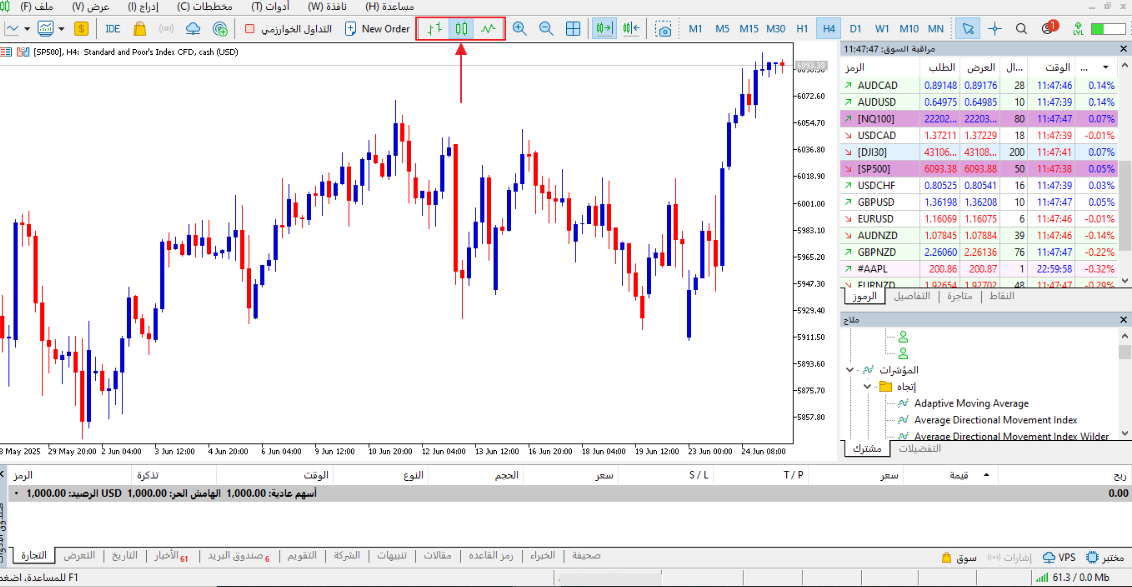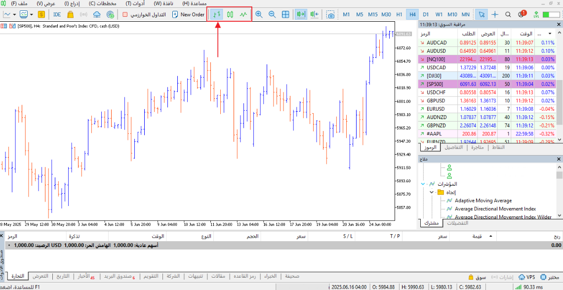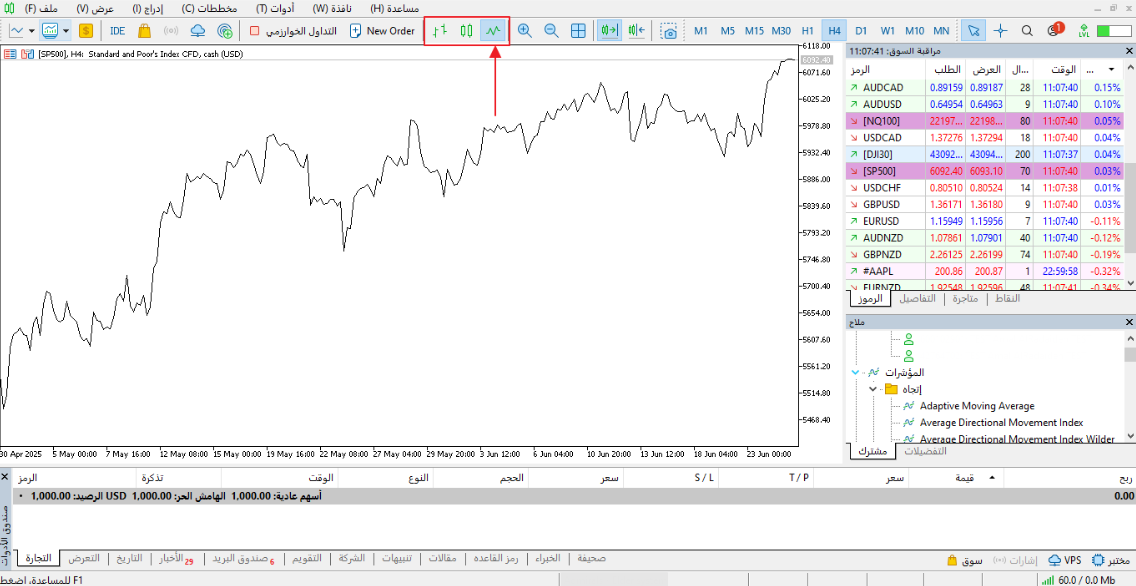 لتنشيط المخطط الخطي، انقر على الأيقونة المقابلة. أدناه، يمكننا أن نرى تمثيل الرسم البياني الخطي في ميتاتريدر: