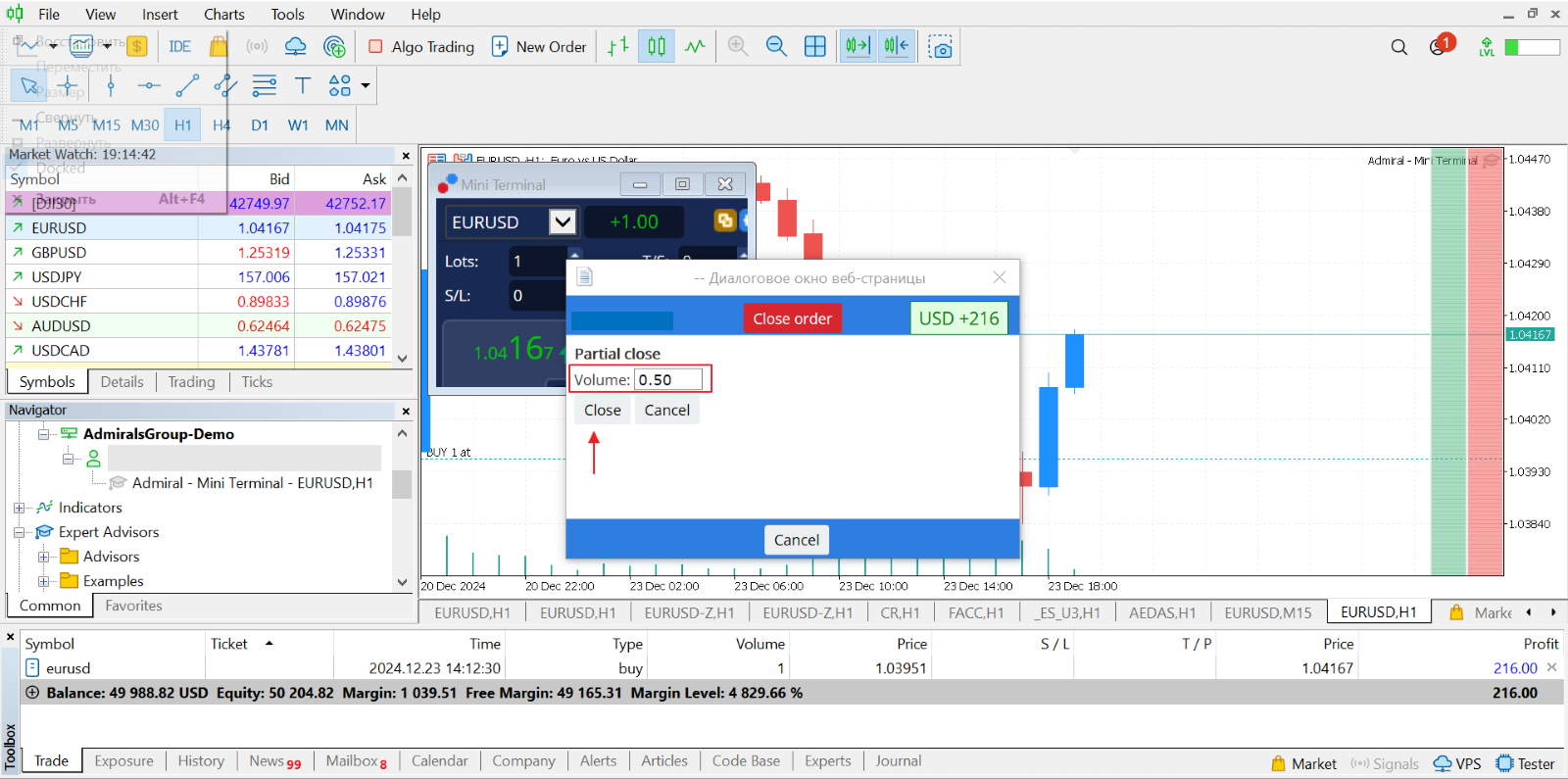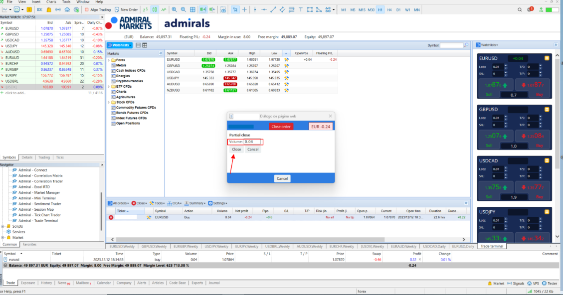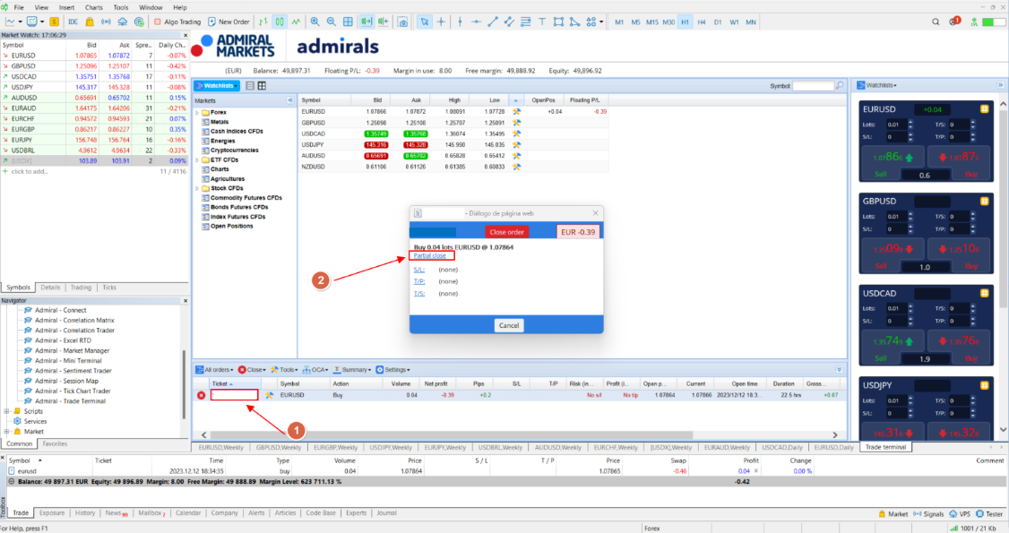 - The second option is through the order ticket. After clicking, a window similar to the one mentioned when we were talking about the Mini Terminal will appear, and you will have to select the “Partial Close” option and set the volume,