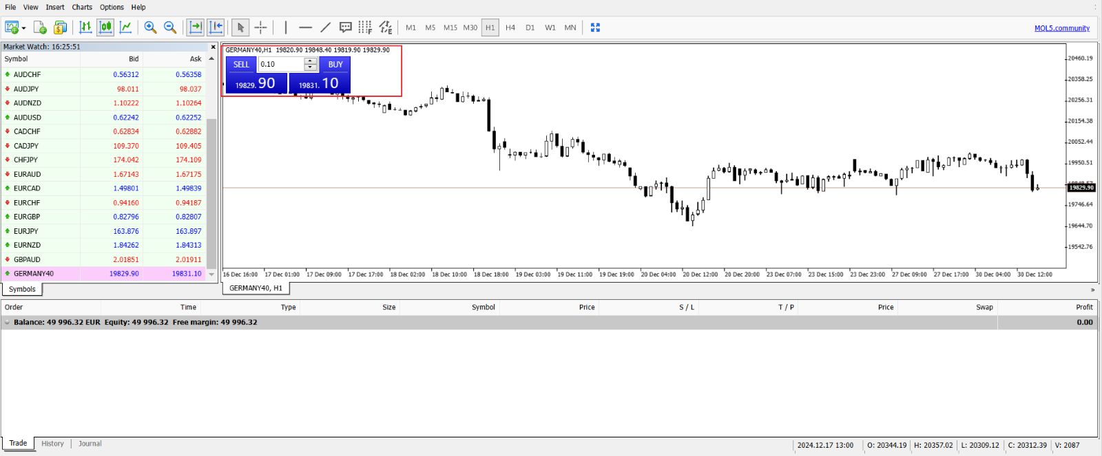 - The third option is to trade directly through the chart. To do this, you can right-click to directly enter a pending order at this level or open the “New Order” window again if you want to enter an order in the market.