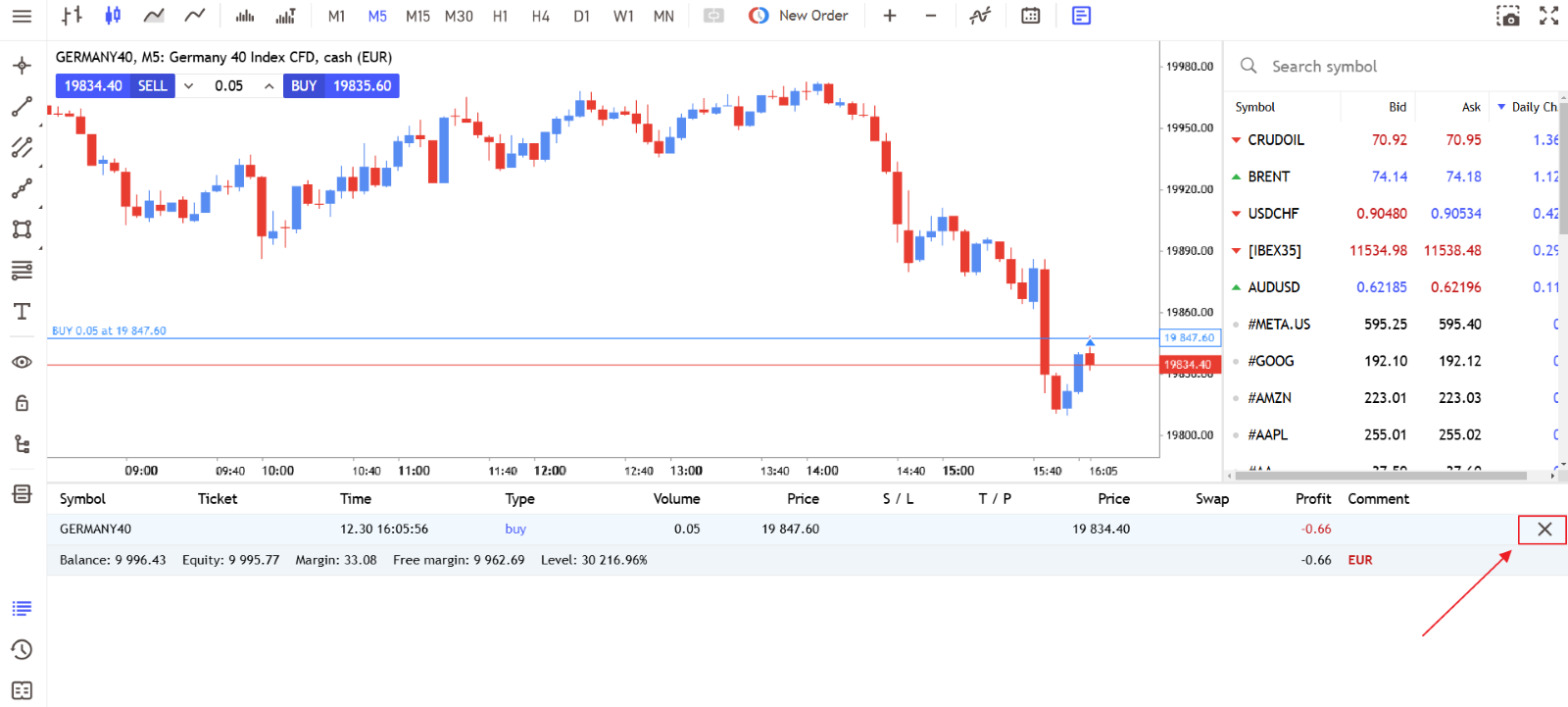 - You can also close a trade by clicking on the cross that appears to the right at the end of the chosen position. Remember that “one-click trading” should be enabled too.