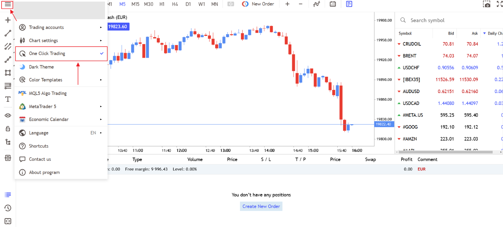 - Finally, you can open a new order using the “One-click trading” option. This is the fastest way to introduce a new order into the market and is the preferred option for scalpers. In this option, you need to set the volume you want to operate and click on the “Sell” or “Buy” button.