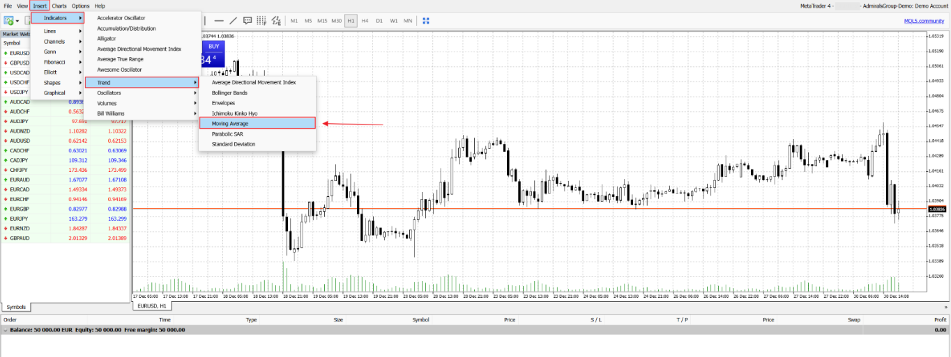 - Click “Insert” and follow the following path: Indicators – Trends – Moving Average. Set the desired parameters for this moving average.