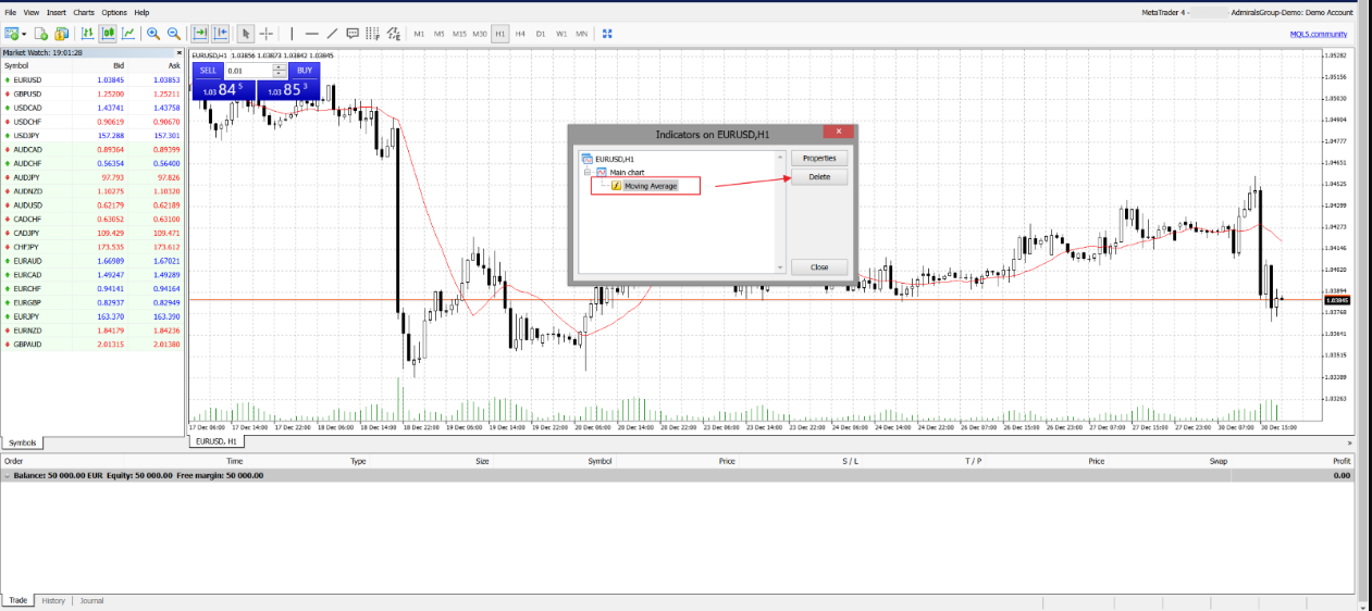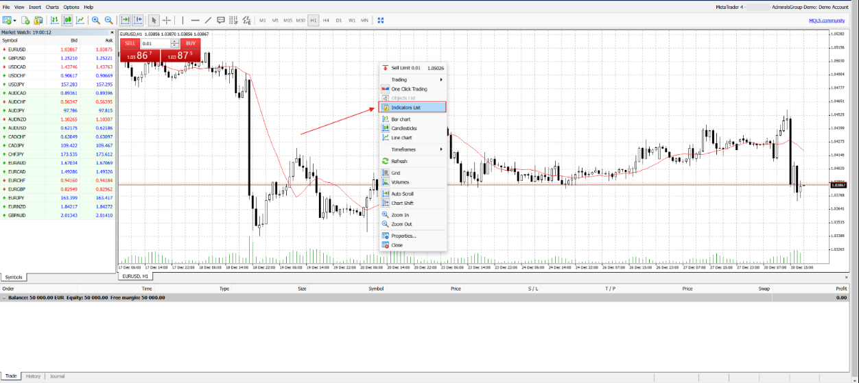 - If we want to delete this indicator, please go to the list of indicators to remove an indicator from the chart. To do this, click the right mouse button on the chart and select the “Indicators List” option.