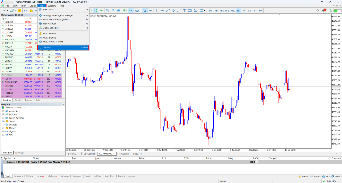- Dans MetaTrader, allez dans Tools et sélectionnez Options.