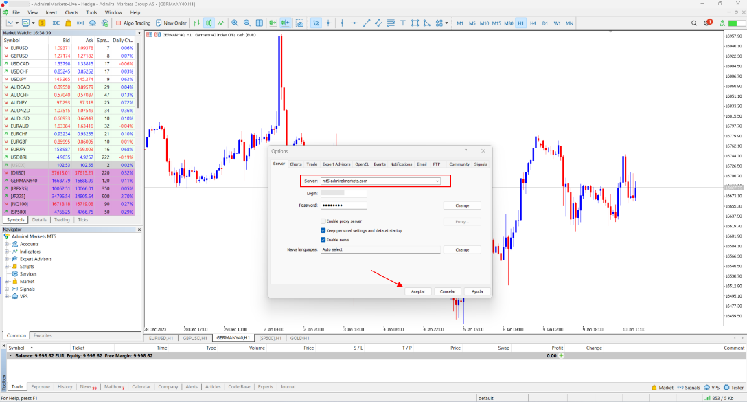 - Saisissez l'adresse DNS, votre numéro de compte de trading et votre mot de passe.