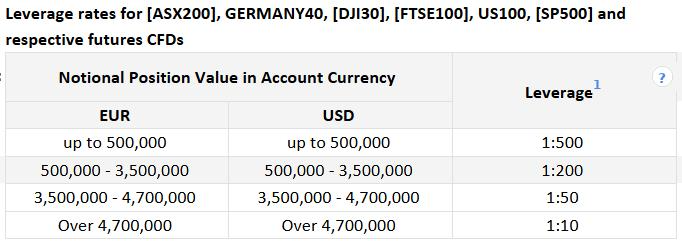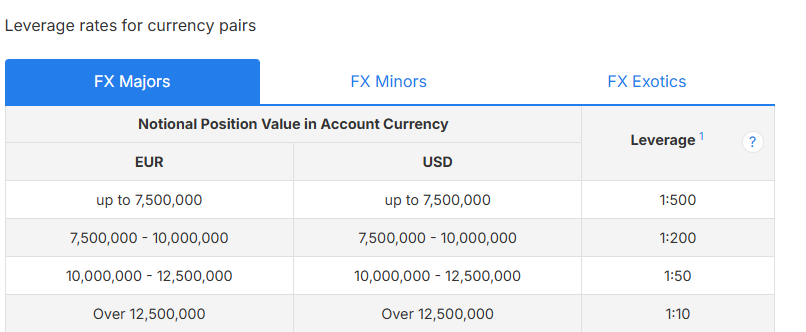 Si le compte de trading a un statut de particulier, nous devons nous référer à l'exigence de marge pour les clients particuliers ici sur notre page Exigences de marge. L'effet de levier est fixe pour les clients particuliers et ne varie pas avec la valeur notionnelle.