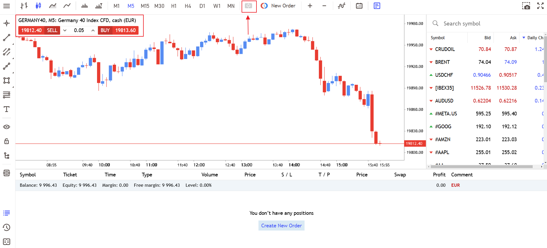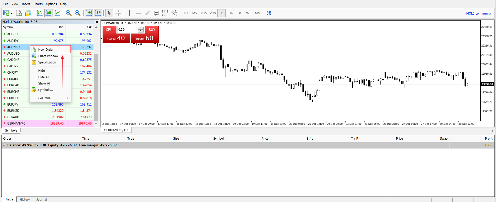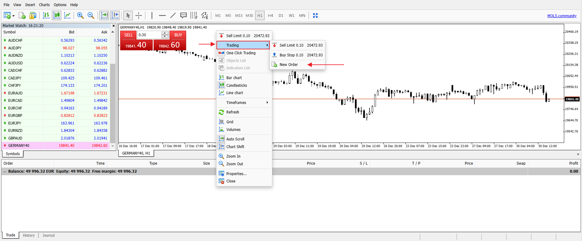 - La troisième option consiste à trader directement via le graphique. Pour ce faire, vous pouvez faire un clic droit pour saisir directement un ordre en attente à ce niveau ou ouvrir à nouveau la fenêtre "Nouvel ordre" si vous souhaitez saisir un ordre sur le marché.