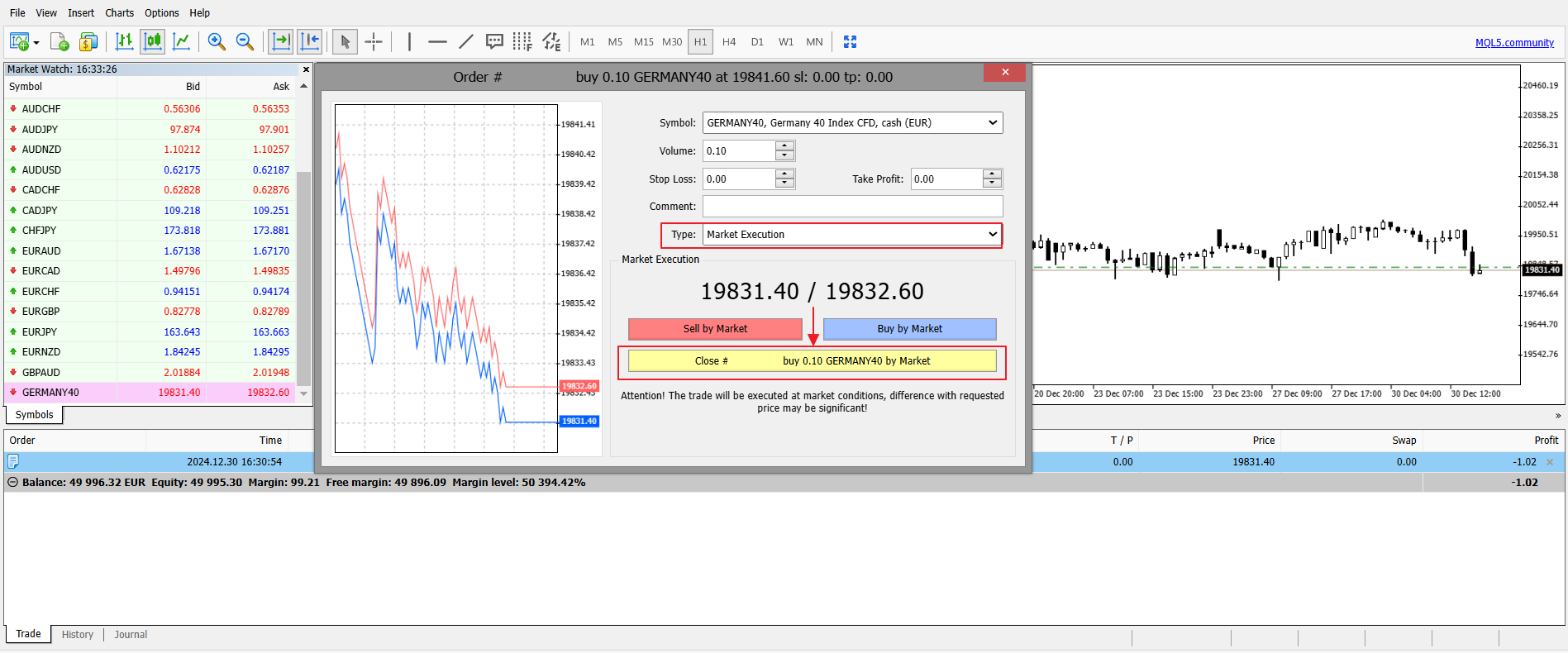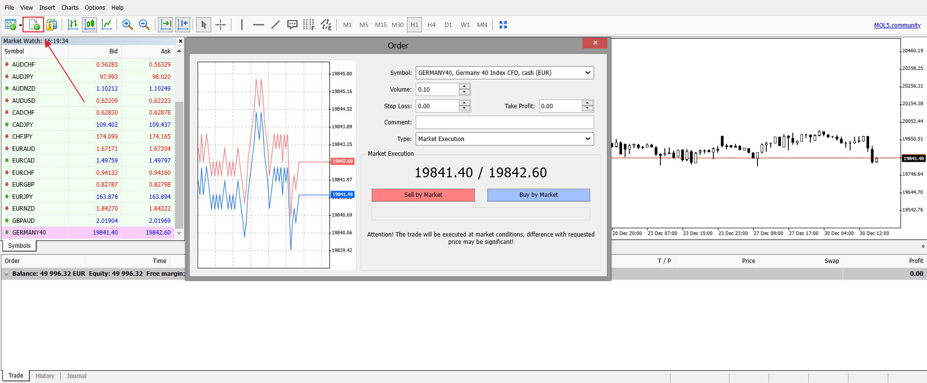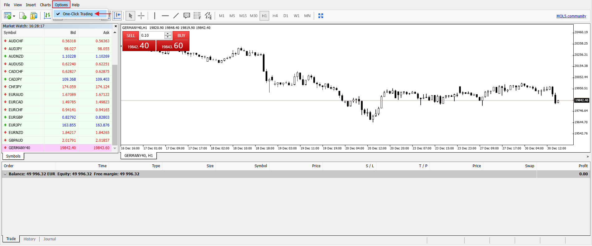 - La troisième option consiste à trader directement via le graphique. Pour ce faire, vous pouvez faire un clic droit pour saisir directement un ordre en attente à ce niveau ou ouvrir à nouveau la fenêtre "Nouvel ordre" si vous souhaitez saisir un ordre sur le marché.