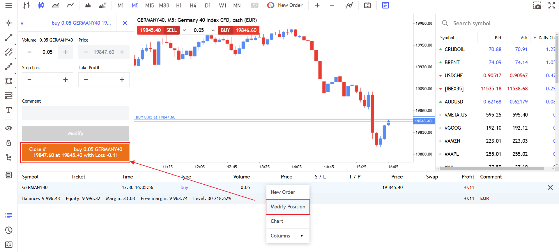 - faites un clic droit sur l'ordre et sélectionnez l'option "Modifier la position". Par la suite, vous pouvez clôturer l'opération en cliquant sur "Fermer".