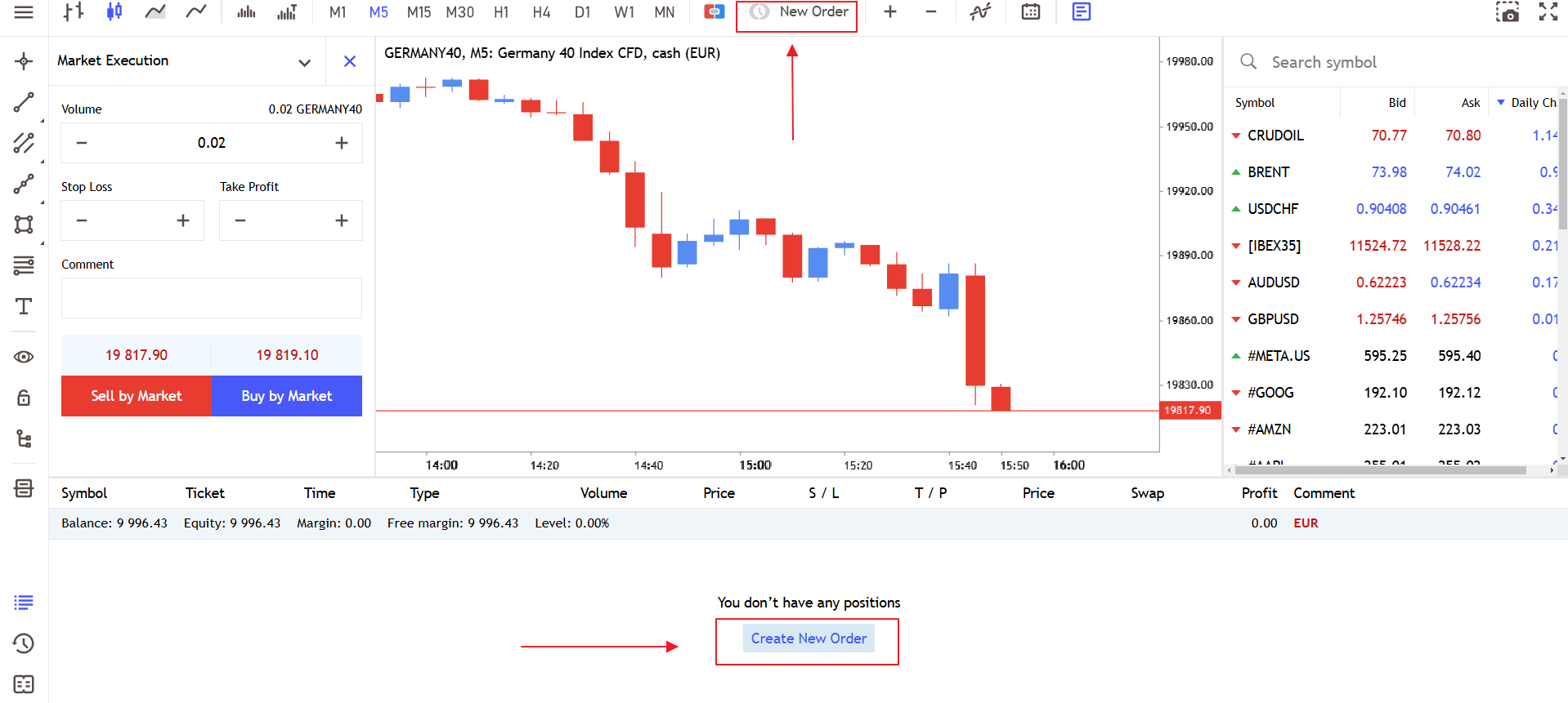 - Dans le menu principal de WebTrader, accédez à l'option "Nouvel ordre". Après avoir cliqué, une nouvelle fenêtre de dialogue s'ouvrira sur le côté gauche de votre écran. Dans cette fenêtre, vous pouvez saisir le type d'ordre et tous les paramètres de cette opération, y compris le stop loss et take profit. Si vous n'avez pas encore de positions ouvertes, vous pouvez également ouvrir cette fenêtre en cliquant sur "Créer un nouvel ordre".