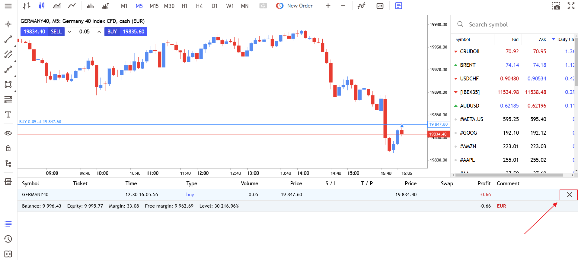 - Vous pouvez également clôturer une transaction en cliquant sur la croix qui apparaît à droite à la fin de la position choisie. N'oubliez pas que le "Trading en un clic" doit également être activé.