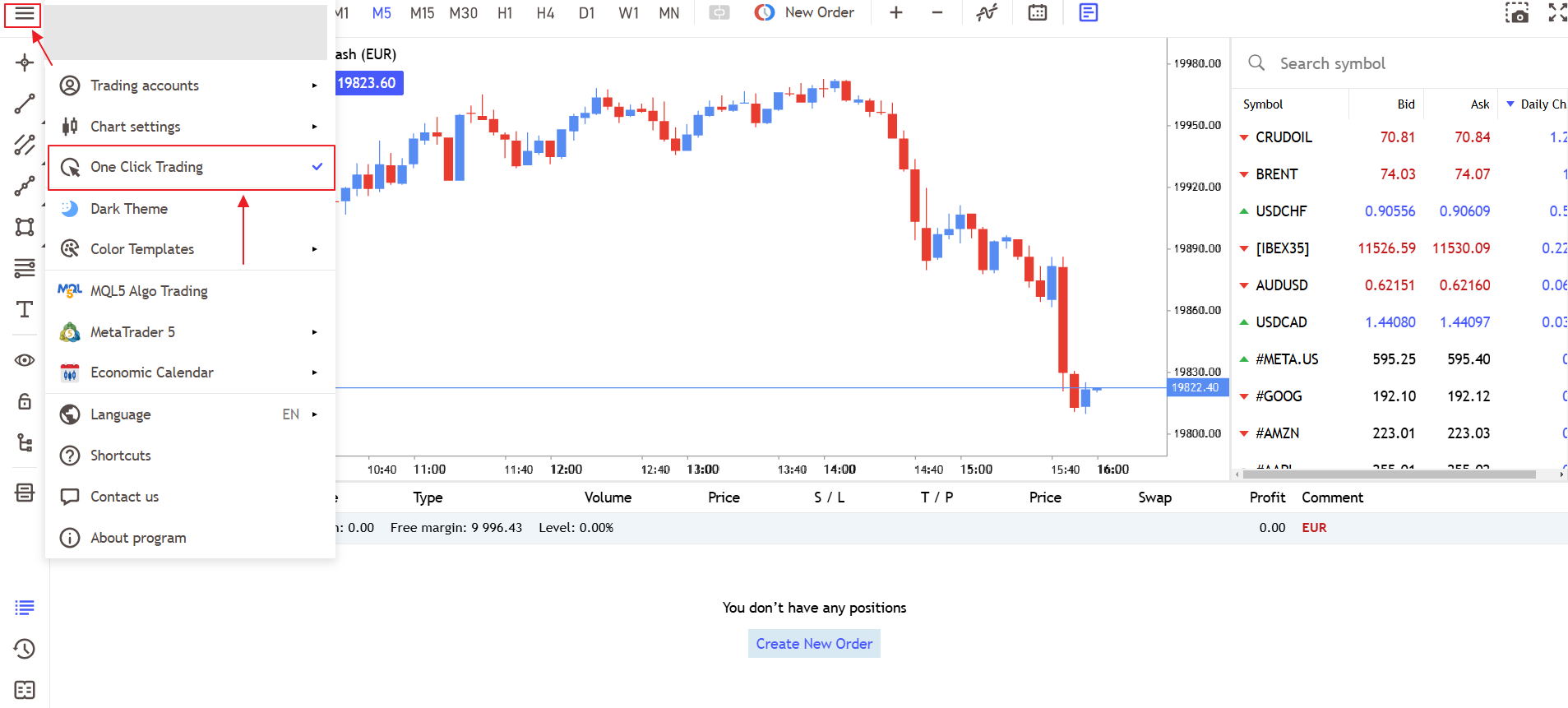- N'oubliez pas que pour cette option, vous devez d'abord activer l'option "Trading en un clic" dans votre WebTrader. Pour ce faire, suivez le chemin : Options -> Trading en un clic