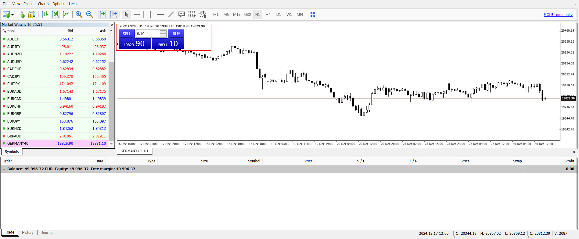 Tout d'abord, vous devez ouvrir le graphique de l'instrument que vous souhaitez négocier, étudier la tendance du marché et prendre la décision d'investissement correspondante. Une fois l'instrument choisi, nous pouvons ouvrir une position en suivant les étapes suivantes :