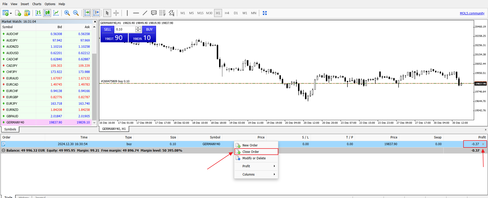- Vous pouvez également fermer une position sous l'onglet "Trade" en faisant un clic droit sur la position, puis en sélectionnant l'option "Fermer la position"