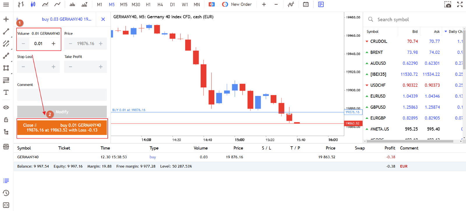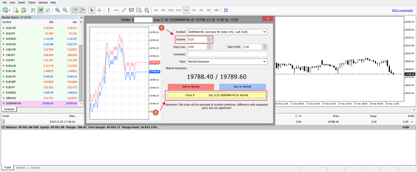 Ensuite, dans la fenêtre ouverte sur le côté gauche, vous devez définir le volume que vous souhaitez clôturer à partir du total de vos positions ouvertes et appuyer sur le bouton orange, ce qui vous permettra de clôturer le volume correspondant,