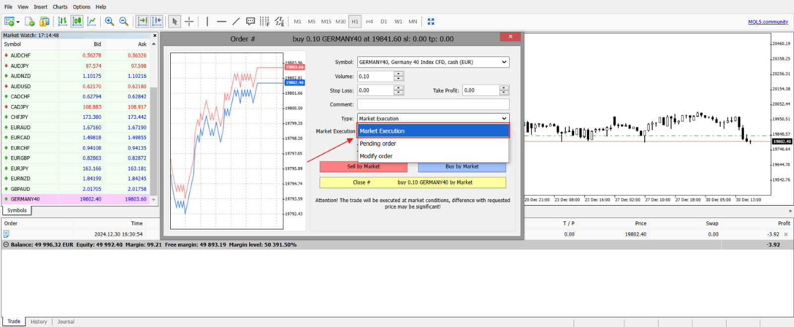 Une fois cette fenêtre ouverte, vous pouvez sélectionner le type d'exécution correspondant "Exécution au Marché",