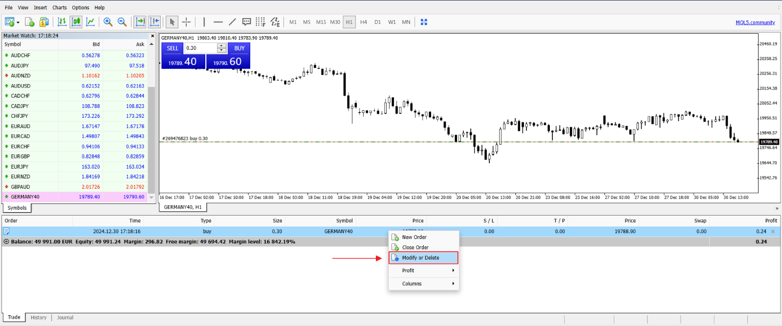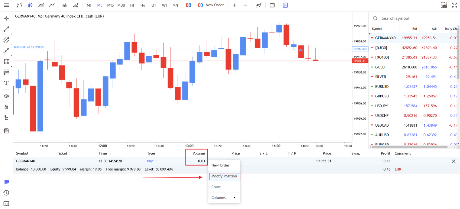 Cliquez avec le bouton droit de la souris sur l'ordre que vous souhaitez clôturer partiellement et sélectionnez l'option "Modifier la Position" pour ouvrir la fenêtre de l’ordre,