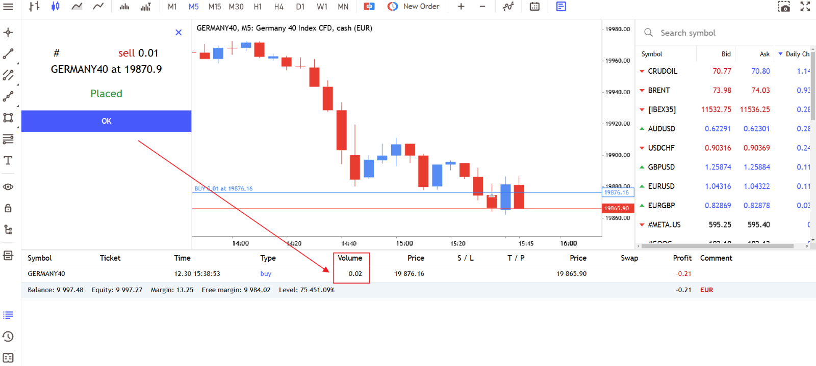 Veuillez noter que pour clôturer partiellement un ordre, vous devez introduire un volume correct dans la mesure où le volume minimum autorisé pour un instrument particulier est de 0,1 lot. Vous ne pourrez pas clôturer partiellement 0,01 lot car ce volume n'est pas autorisé.