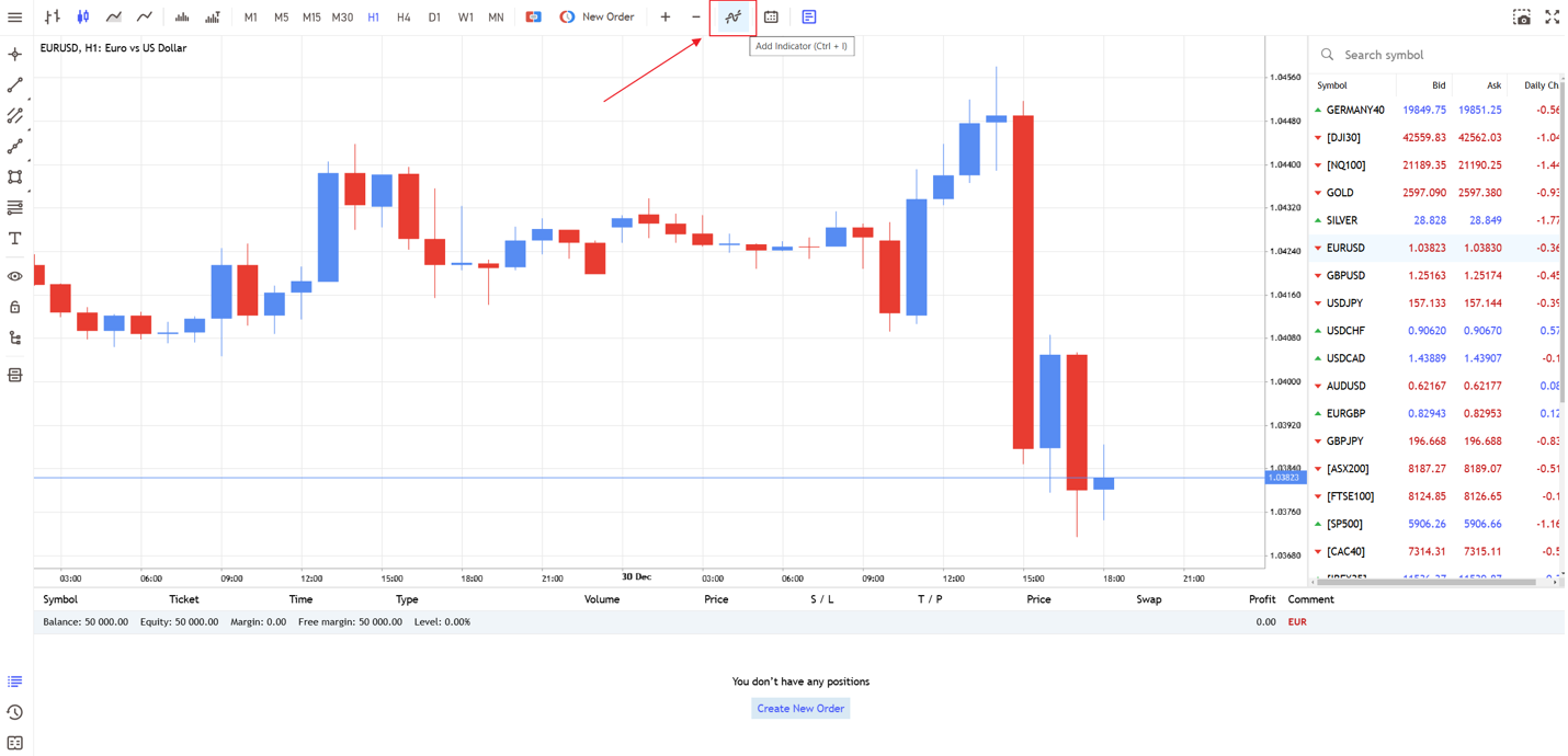 - Cliquez sur le bouton « Ajouter un indicateur » ou appuyez sur Ctrl+I,