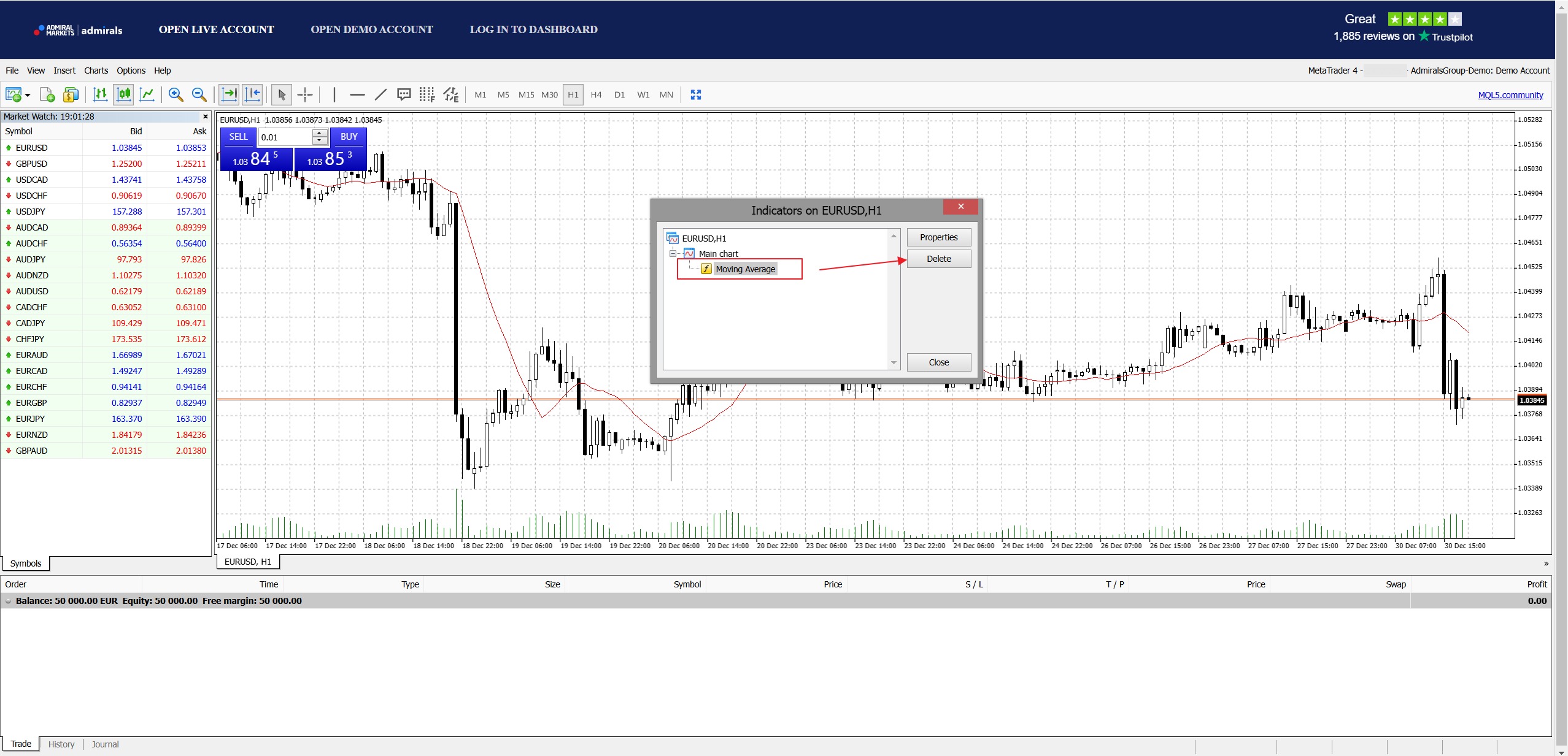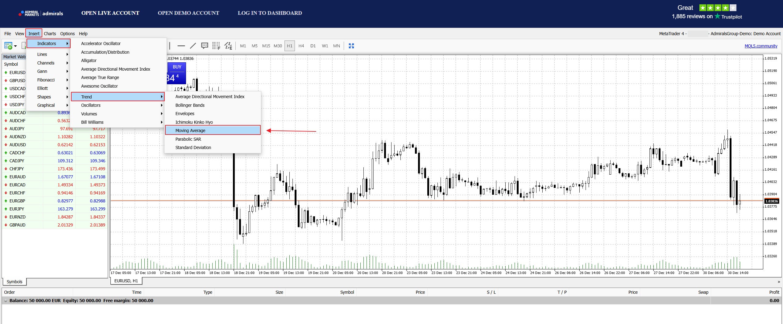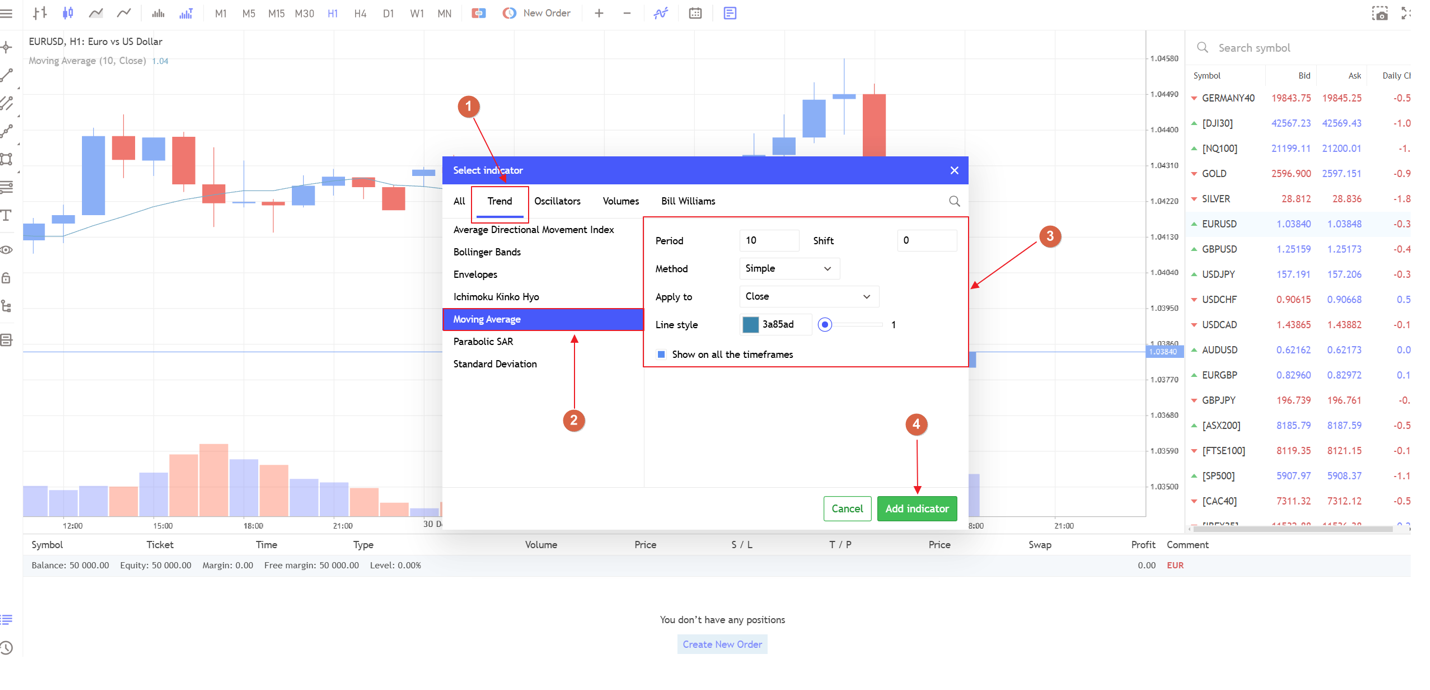 - Dans notre exemple, nous voulons ajouter une Moyenne Mobile, alors veuillez sélectionner l'onglet des indicateurs de tendance et choisir l'option « Moyenne Mobile ».