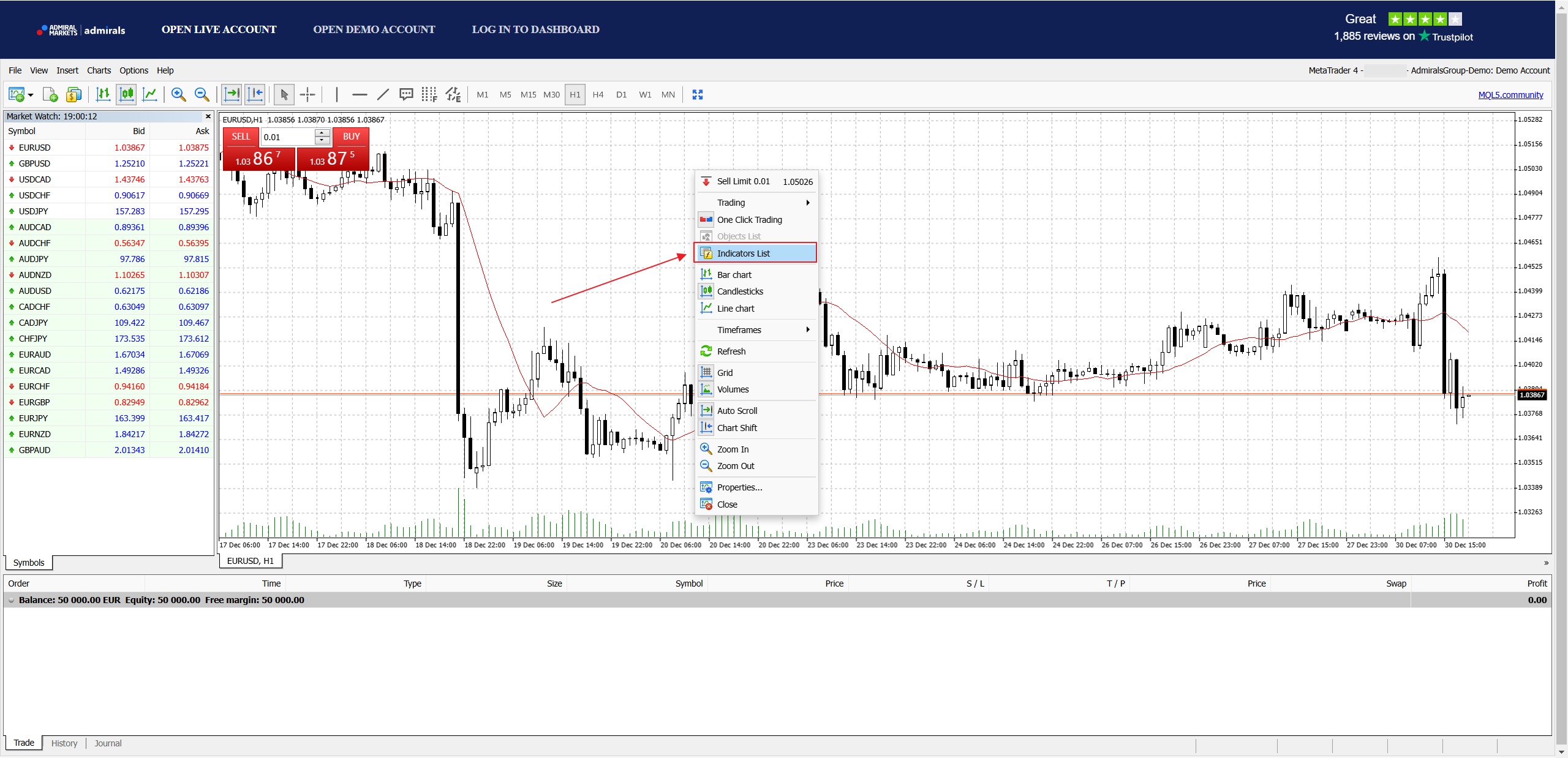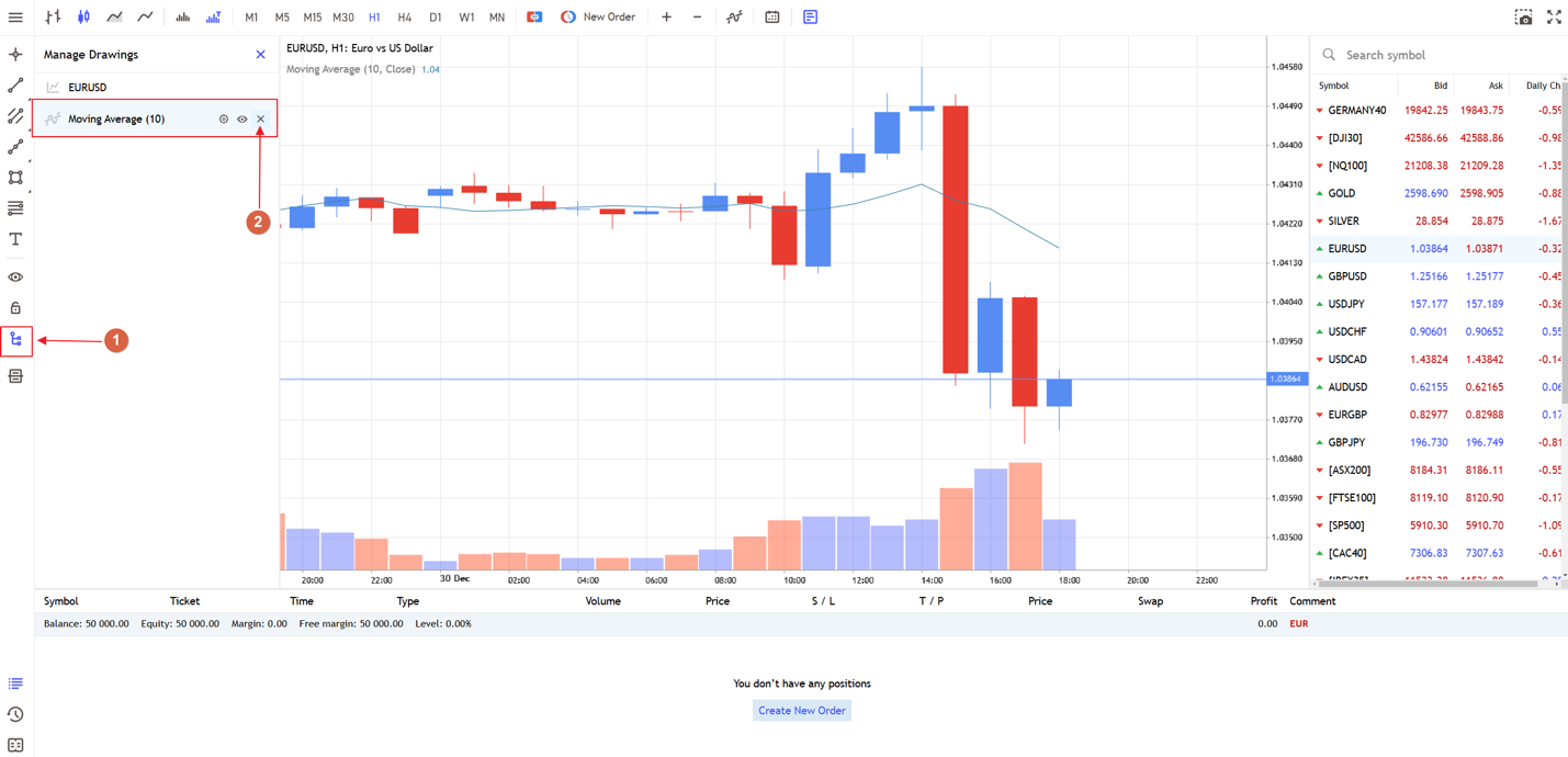 - Si vous souhaitez supprimer cet indicateur, veuillez accéder à la liste des indicateurs pour le retirer du graphique. Pour ce faire, faites un clic droit sur le graphique et sélectionnez l'option « Liste des indicateurs ».