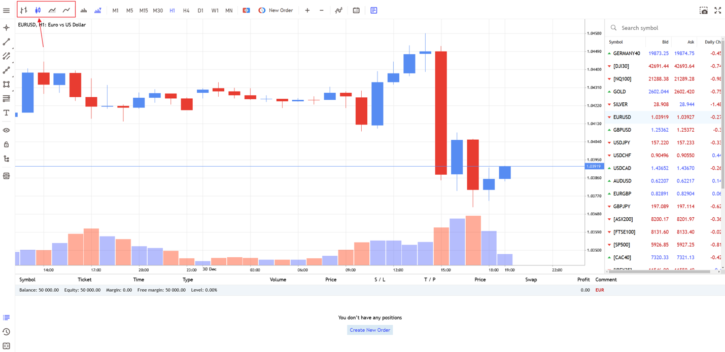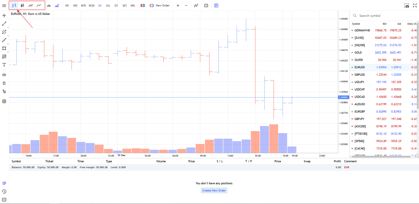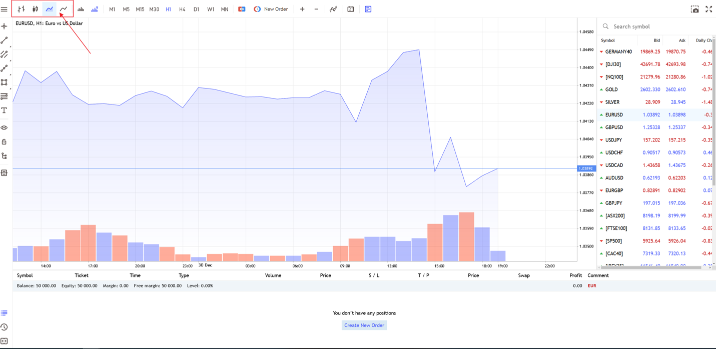 Comme c'est le cas avec la plateforme MetaTrader, sur WebTrader nous disposons également de 3 types de graphiques qui nous permettent d'analyser un instrument spécifique et l'évolution de son prix au fil du temps. Bien qu'ils soient tous basés sur le prix d'achat coté, les informations visibles diffèrent selon le type de graphique.
