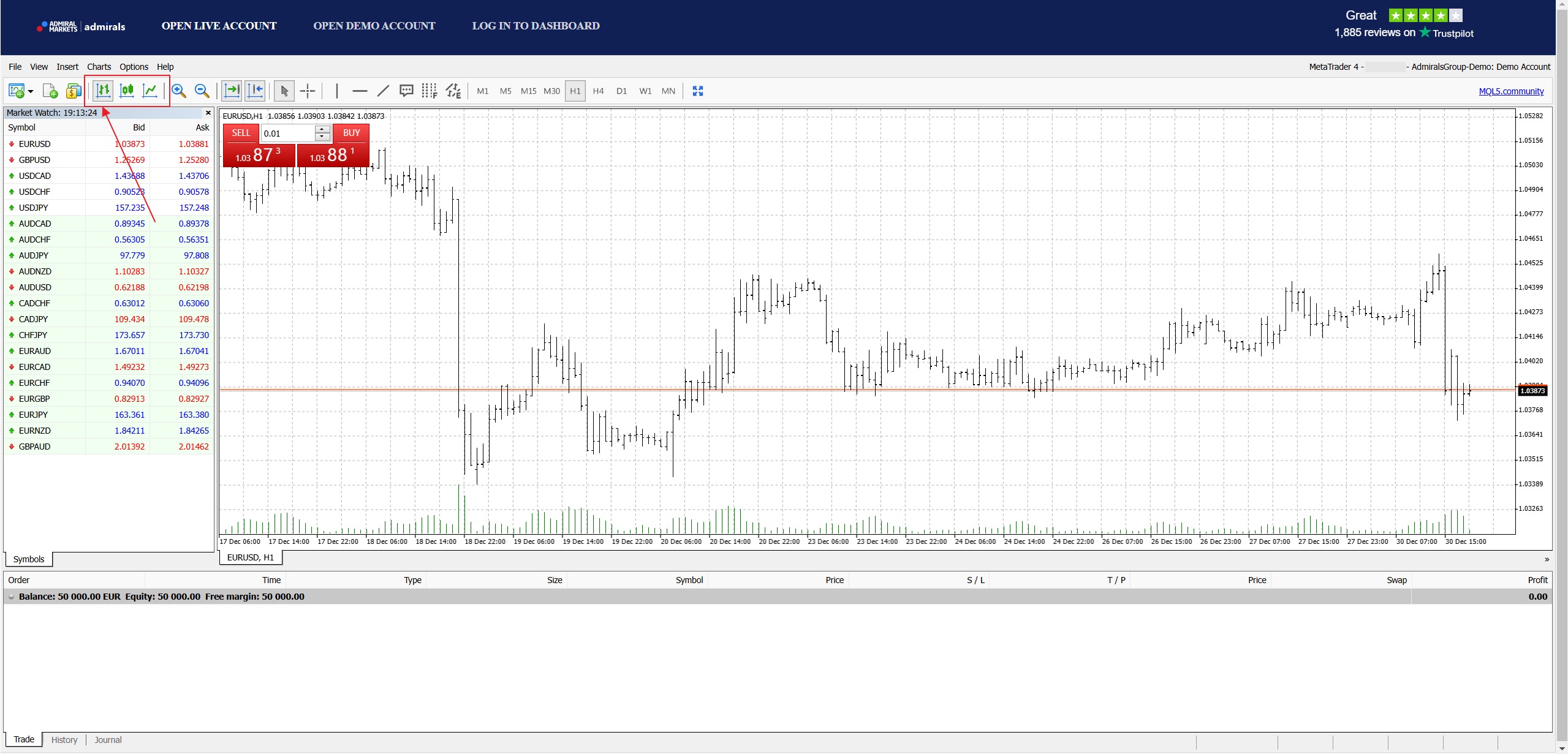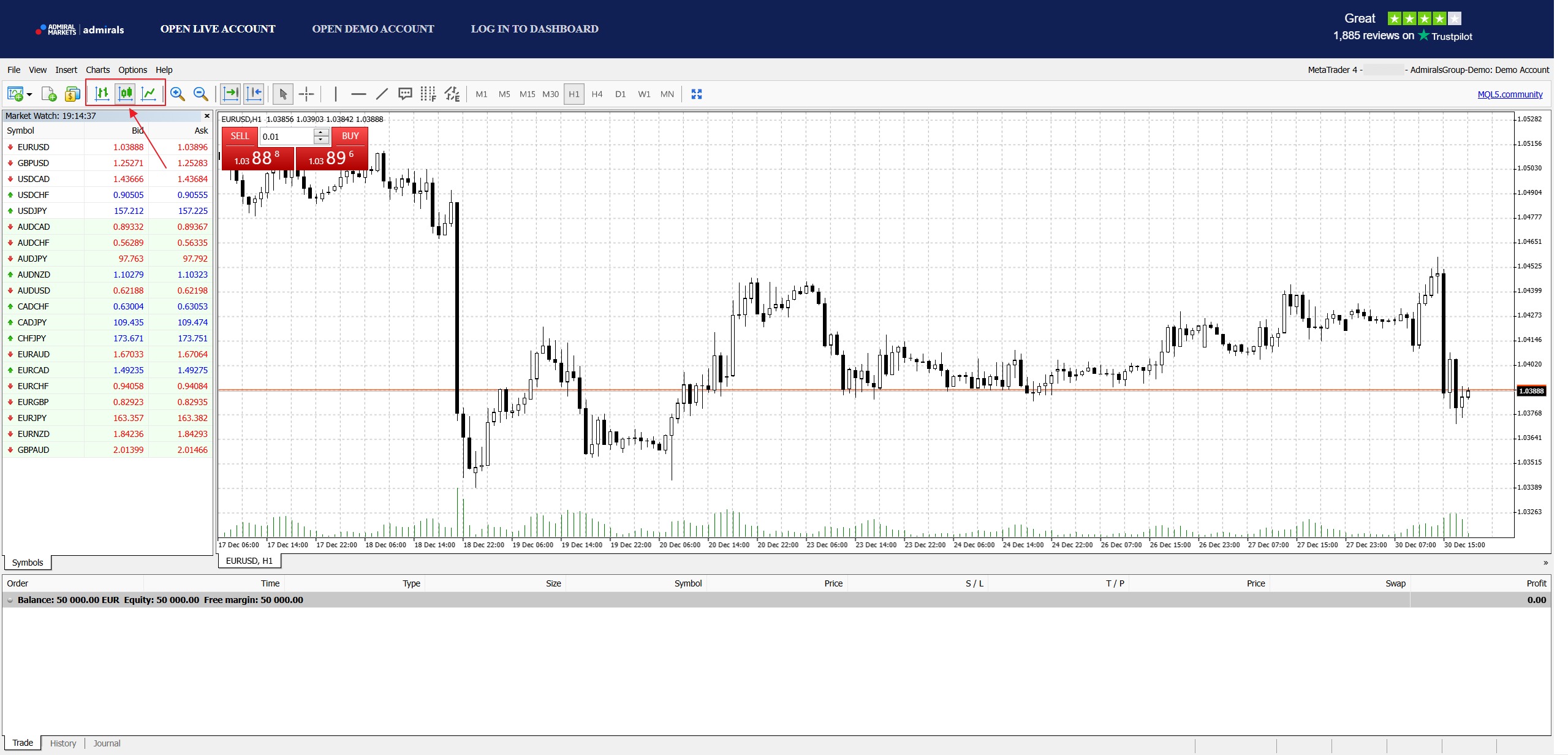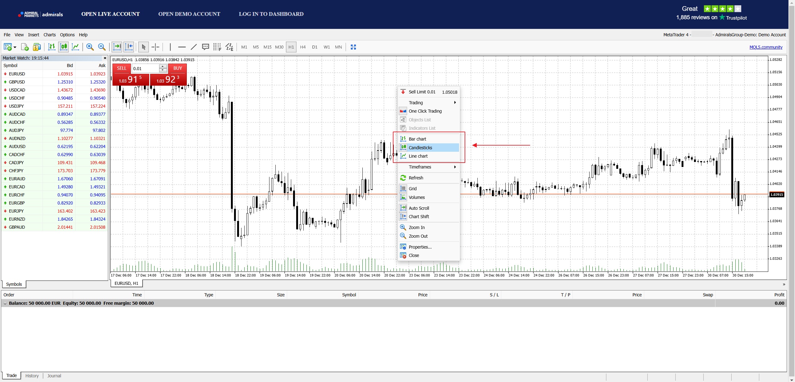 Pour activer un graphique en chandeliers, cliquez sur l'icône correspondante.
