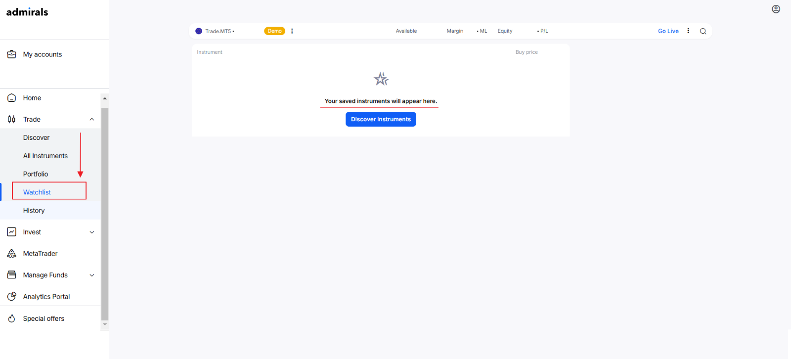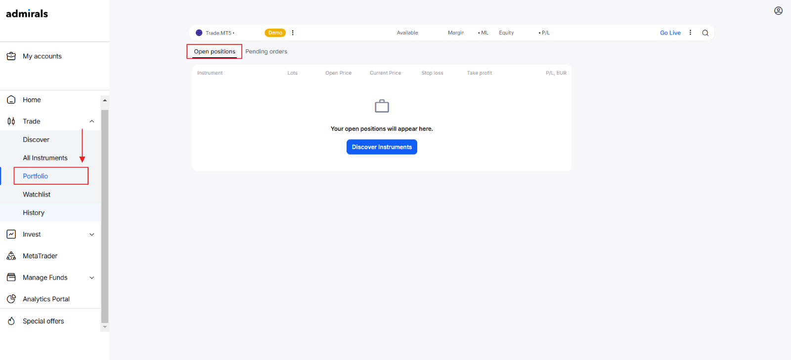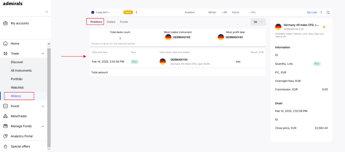 À l'intérieur de la Plateforme Admirals, vous verrez le menu d'options suivant sur la gauche et les informations du compte en haut.