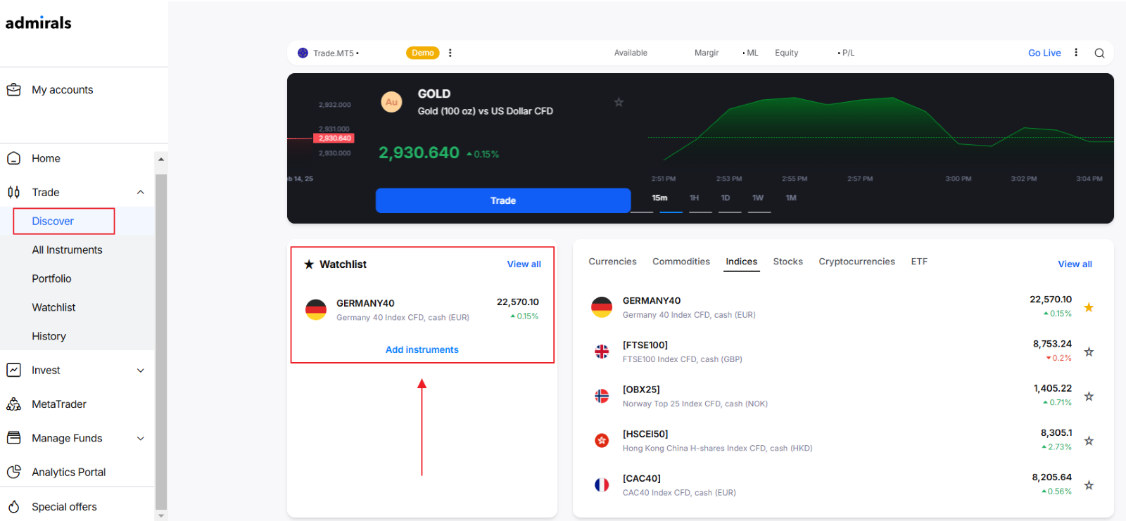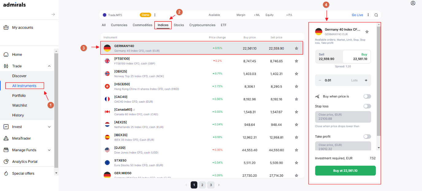 À partir de cette option, nous pouvons accéder à la liste complète des instruments disponibles pour un type de compte spécifique. Supposons que nous ayons un compte Trade.MT5 et que nous voulions trader l'indice allemand (Germany40). Pour ce faire, suivez le chemin : Instruments ---> Indices ---> Germany40.