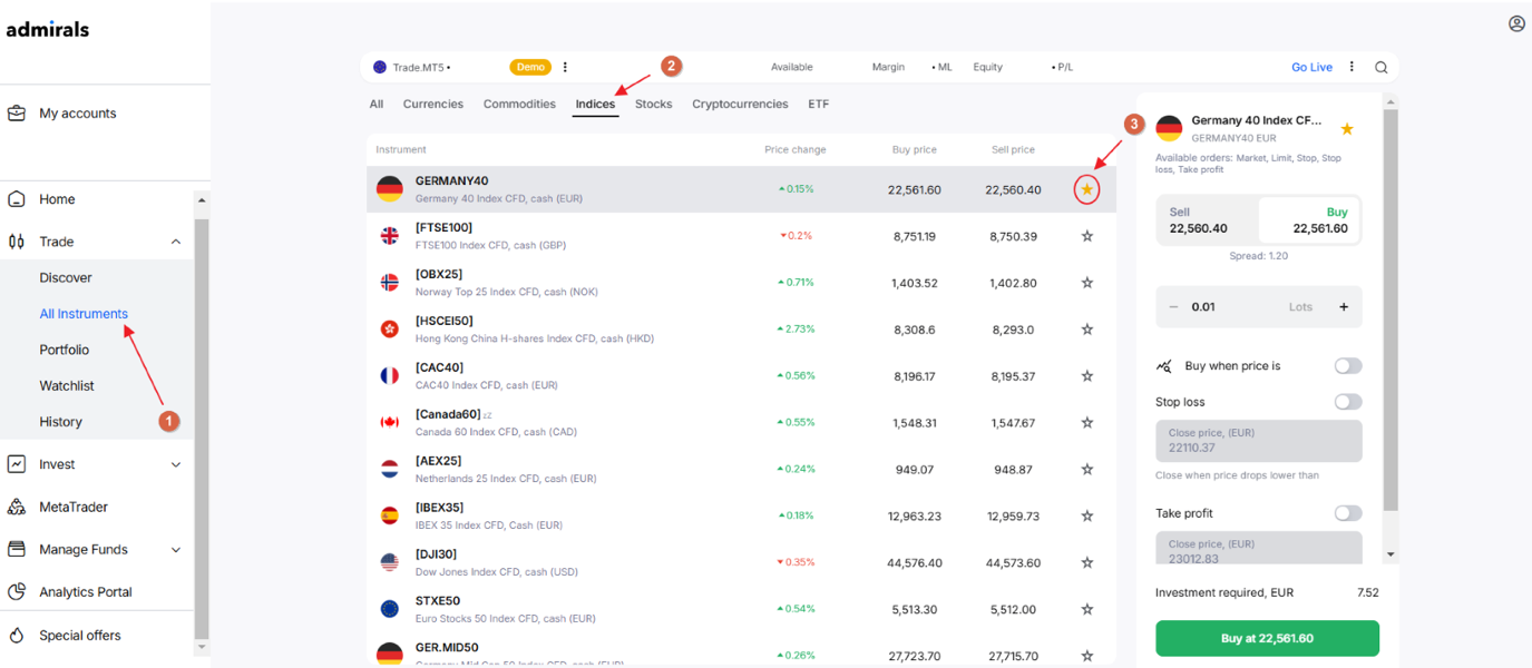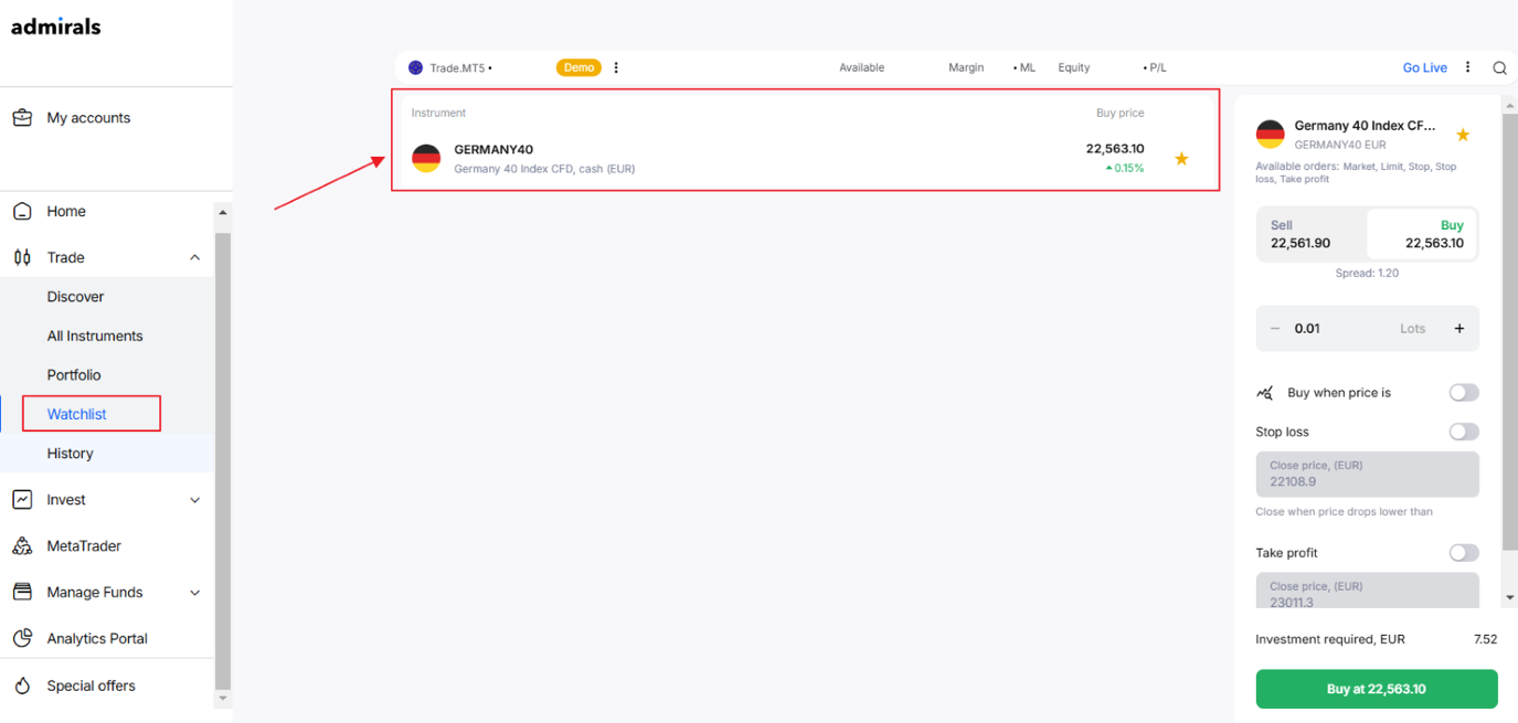 Depuis la section « Tous les instruments », nous pouvons ajouter un produit spécifique à cette liste. Voyons ci-dessous un exemple de l'indice GERMANY40-Т.