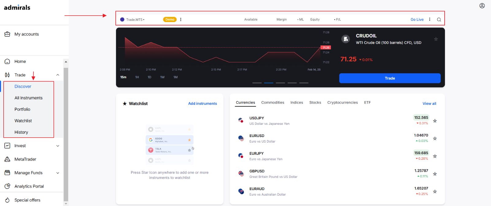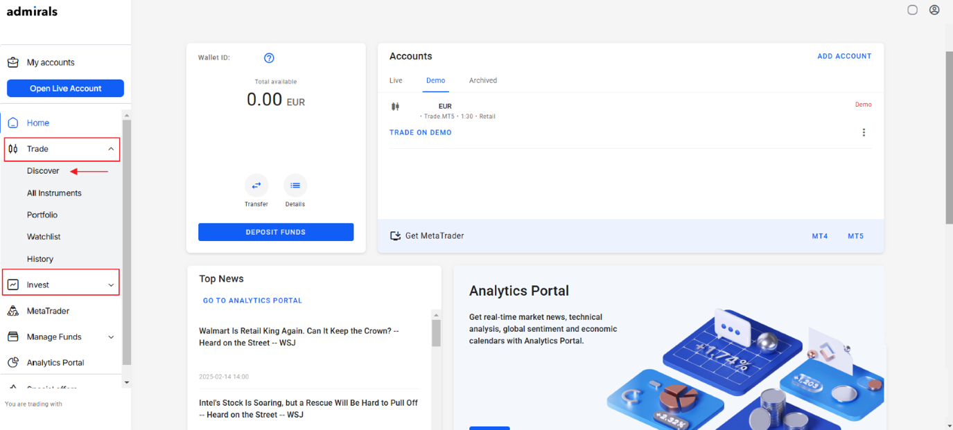 Pour accéder à la Plateforme Admirals, veuillez vous connecter à votre Tableau de bord et choisir parmi les options suivantes : Trade ou Invest ---> Découvrir :
